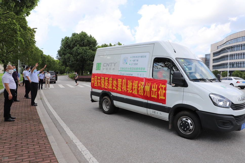 除了中國(guó)天楹自有力量,通過(guò)勞務(wù)公司緊急招聘的現(xiàn)場(chǎng)操作工也迅速到位,包含駕駛員、收運(yùn)員和現(xiàn)場(chǎng)輔助工在內(nèi)的馳援隊(duì)伍,在揚(yáng)州市生態(tài)環(huán)境局的統(tǒng)一指揮和揚(yáng)州揚(yáng)楹的集中調(diào)配下,積極進(jìn)入戰(zhàn)斗狀態(tài)。與此同時(shí),中國(guó)天楹緊急采購(gòu)兩臺(tái)應(yīng)急方艙設(shè)施(一輛移動(dòng)式醫(yī)療廢物處置車(chē)、一座醫(yī)療廢物移動(dòng)方艙),并從河南平頂山項(xiàng)目迅速調(diào)度了4輛醫(yī)廢運(yùn)輸車(chē)。8月10日,江蘇省生態(tài)環(huán)境廳從南京市抗疫力量中抽調(diào)增援的7輛醫(yī)療廢物轉(zhuǎn)運(yùn)車(chē)、14名駕駛員和收運(yùn)員抵達(dá)揚(yáng)州,編入揚(yáng)州揚(yáng)楹隊(duì)伍。至此,揚(yáng)州揚(yáng)楹的工作團(tuán)隊(duì)從49人增加到115人,醫(yī)療廢物運(yùn)輸車(chē)達(dá)到26輛,日均醫(yī)廢收運(yùn)能力從20噸提高到60噸以上,日均醫(yī)廢處置能力從15噸提高到40噸。