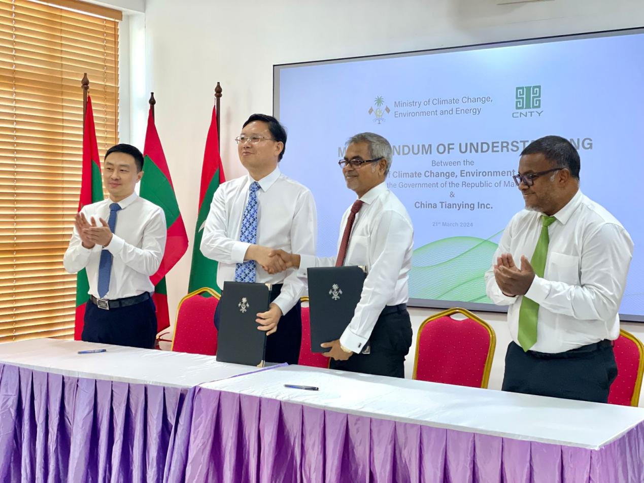3月21日,中國(guó)天楹總裁曹德標(biāo)同馬爾代夫氣候變化、環(huán)境與能源部長(zhǎng)陶瑞克·易卜拉欣正式簽署合作備忘錄,雙方將努力協(xié)作,共同應(yīng)對(duì)氣候變化,在可持續(xù)發(fā)展、能源轉(zhuǎn)型、環(huán)境保護(hù)、循環(huán)經(jīng)濟(jì)以及低碳城市發(fā)展等議題上展開(kāi)深度合作。